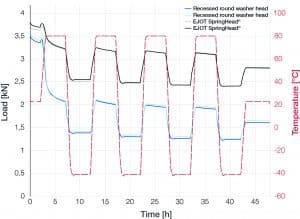 When a screw joint is cooled down, the clamp load is reduced due to different thermal expansion coefficients involved. In contrast, re-heating increases the clamp load. To ensure an appropriate clamp load during application, it may be necessary to incorporate a spring element into the joint to minimise clamp load variations. Ideally, such an element would be suitable for automatic feeding. At the same time, it should prevent high local surface pressures as these can cause creep in sensitive materials.